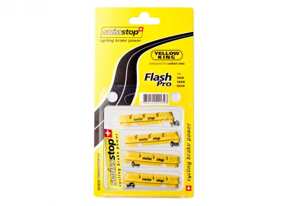 Gomme Yellow king : pour une puissance de freinage absolue (par temps humide et sec) et une précision absolue de la temporisation sur les jantes en carbone. Pas de grincement et une ususre réduite au minimum. Garniture pouvant chauffer brièvement à plus de 300° C. Utilisable également sur jantes aluminium